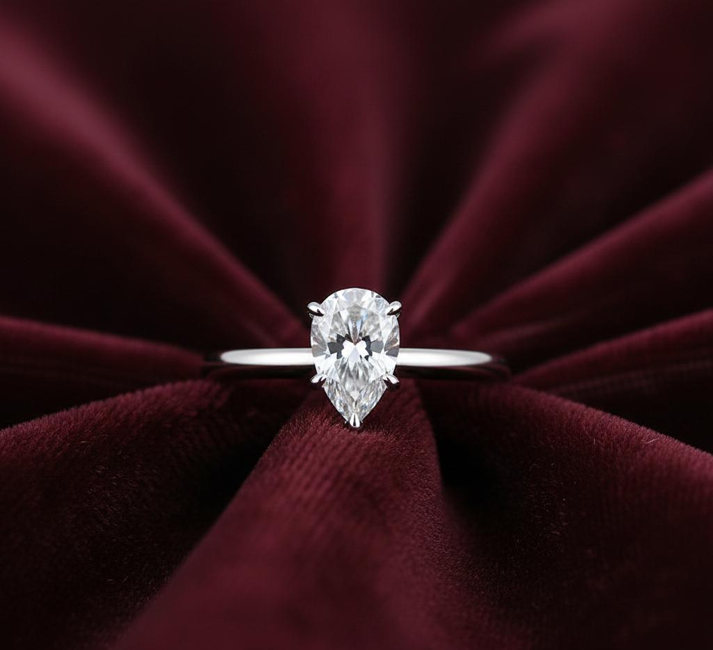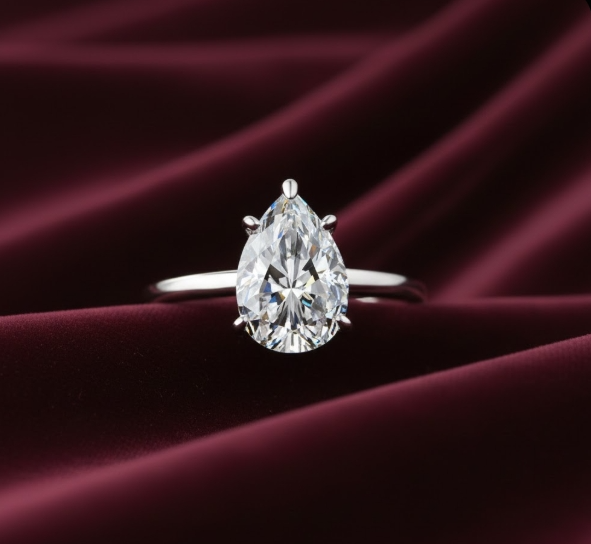 The central stone is a Moissanite, a lab-created gemstone known for its exceptional brilliance and fire, often exceeding that of a diamond due to its higher refractive index. It features a Pear Cut, also frequently referred to as a Water Drop or Teardrop shape. This cut is a hybrid of a round brilliant and a marquise shape, with one rounded end and one tapered point.