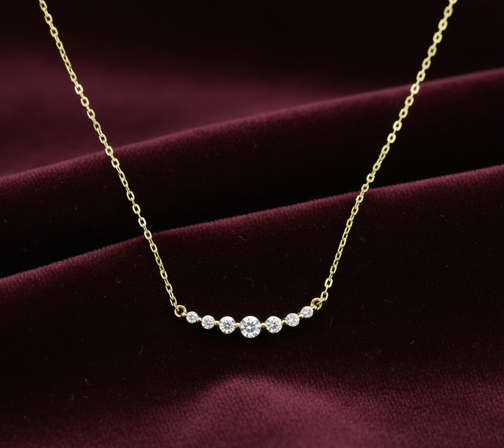 Complementing the warm gold tone, this necklace features a graceful, curved bar design. Seven brilliant-cut zircon stones (diamond simulants) are meticulously set in a graduating sequence, with the largest stone at the centre. The entire piece is crafted from 14K gold-plated sterling silver, offering continuous, subtle sparkle that perfectly balances with every day’s go to collection.